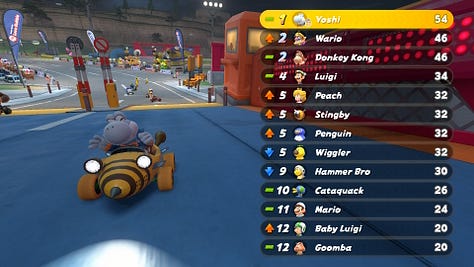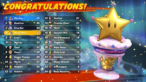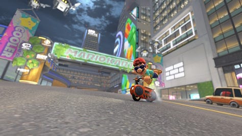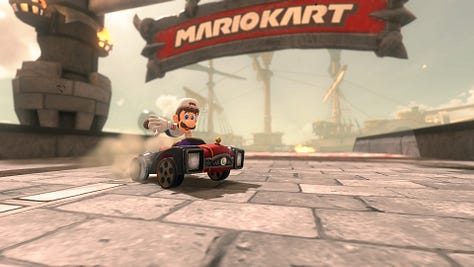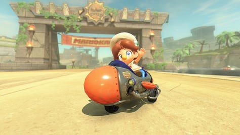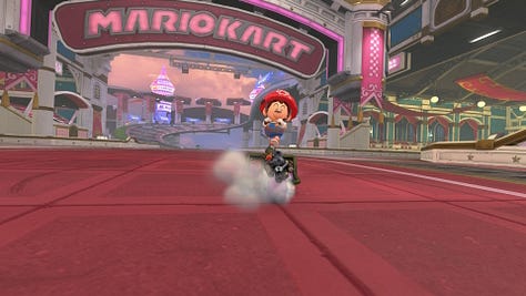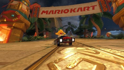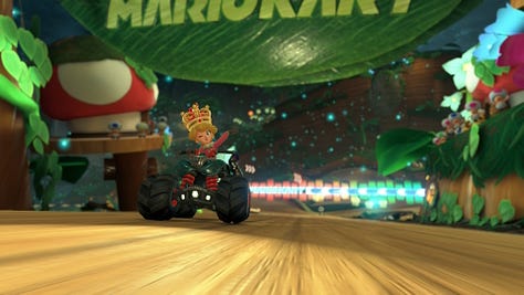 After three-plus days on MKW’s interconnected continent, we had one gold trophy. It didn’t belong to me. My youngest daughter earned the first gold, which I’m proud of because she’s grown up in an environment that honed her skills but also why couldn't I win a gold trophy? Our first weekend with MKW showed us the chaos of 24-racer fields propelled by constant mushrooms and bombarded with shells and fireballs and the new mushroom that enlarges trailing competitors and lets them squish you. We adjusted to the chaos, to traffic patterns of civilian toads and Yoshis who should definitely not merge onto active courses, and got used to yo-yoing from third to 14th and back up to the front. But none of us could reliably finish first, especially in the newest, toughest, best addition to the franchise.